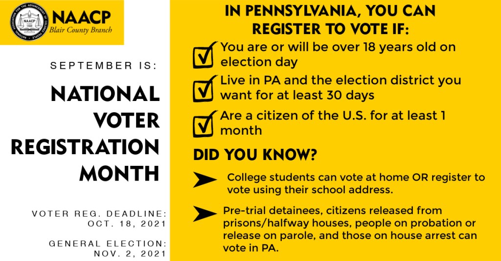 Throughout the month of October and into the month of November, the Blair County NAACP conducted several meetings to raise voter awareness and mobilize souls to the polls. The Blair County Branch, under the leadership of President Andrae Holsey, co-organized and hosted a Candidate forum with Indivisible – Blair County and the PSU Altoona Political Science Society on Penn State University – Altoona Campus at the Laurel Pavilion. This event provided students and community members the opportunity to engage local election candidates, meet local non-profit groups committed towards racial and economic justice, and register both to vote and/or join the NAACP. Attendees included Blair County NAACP President Andrae Holsey, PSU Altoona Chancellor Dr. Lori Bechtel-Wherry, AASD School Board Member Rick Hoover, AASD School Board Candidate Tina Johnston, Altoona City Council Member Dave Butterbaugh, Altoona City Council Candidates Bridgette Jackson, Mike Leonard, and Dave Ellis, PSU Political Science Society President Maleah Orr, Indivisible – Blair County President Carol Evon Taylor, dozens of other community acitivists and dozens of community members.